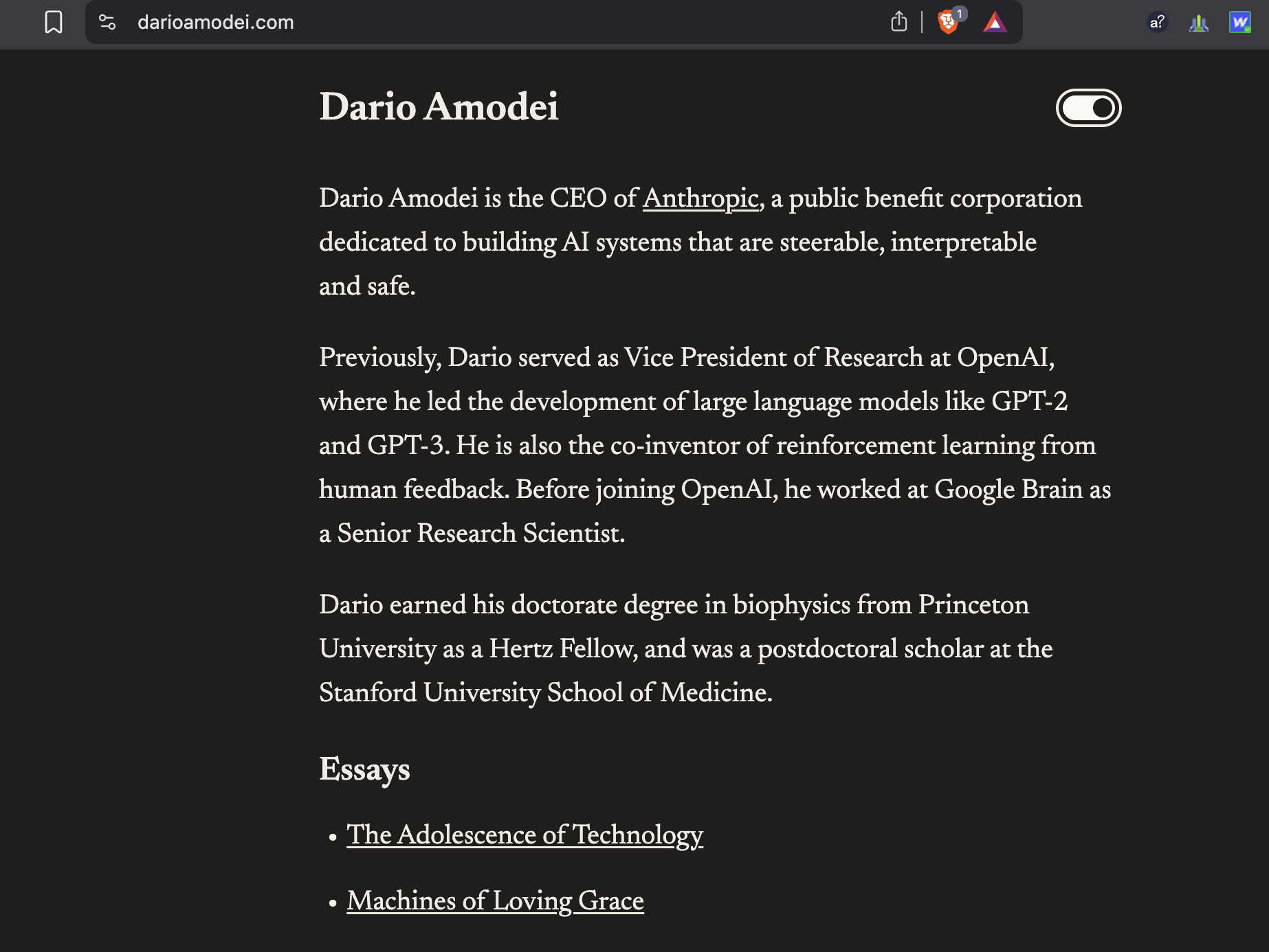 Also interesting in the personal website of Dario Amodei (the CEO and co-founder of Anthropic) is also built with Webflow - the one page site is very simple in terms of design but still it's an interesting that he chose Webflow